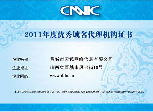 點(diǎn)擊查看 CNNIC 2011年度優(yōu)秀域名代理機(jī)構(gòu)證書: